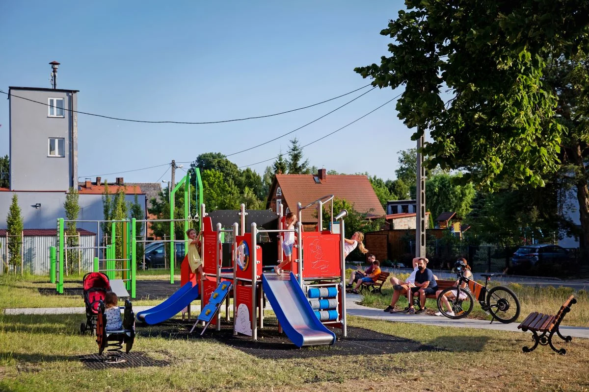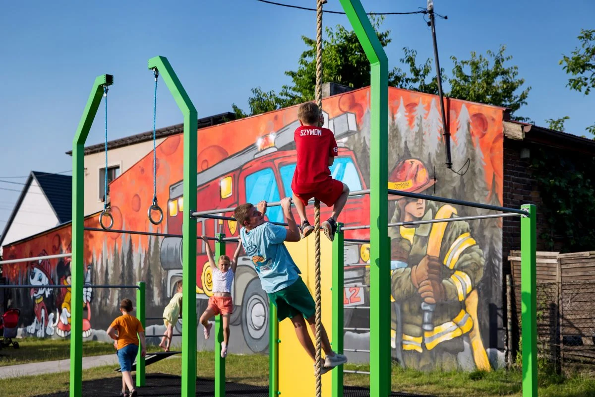 Dodatkowo – dzięki inicjatywie mieszkańców dzielnicy, którzy z sukcesem zorganizowali internetową zbiórkę pieniędzy – na pustej ścianie sąsiadującego ze skwerem budynku powstał wielkoformatowy mural ze strażackimi motywami, które z pewnością przypadną do gustu najmłodszym użytkownikom zieleńca.
