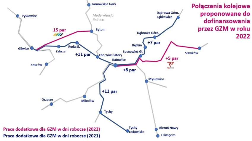 Metropolia będzie dalej dofinansowywać połączenia na głównych trasach: Gliwice-Katowice Dąbrowa Górnicza oraz Tychy-Katowice-Dąbrowa Górnicza. W 2021 roku przeznaczyła na 48 połączeń kwotę 9,2 mln zł.