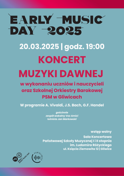 Przed nami 13. edycja Early Music Day, czyli Dnia Muzyki Dawnej – projektu europejskiej organizacji REMA. Na mapie tegorocznych wydarzeń, koncertów i happeningów, odbywających się jednocześnie w całej Europie, znalazły się także Gliwice, a konkretnie Państwowa Szkoła Muzyczna I i II st. im. Ludomira Różyckiego, która 20 marca zaprasza na Koncert Muzyki Dawnej.