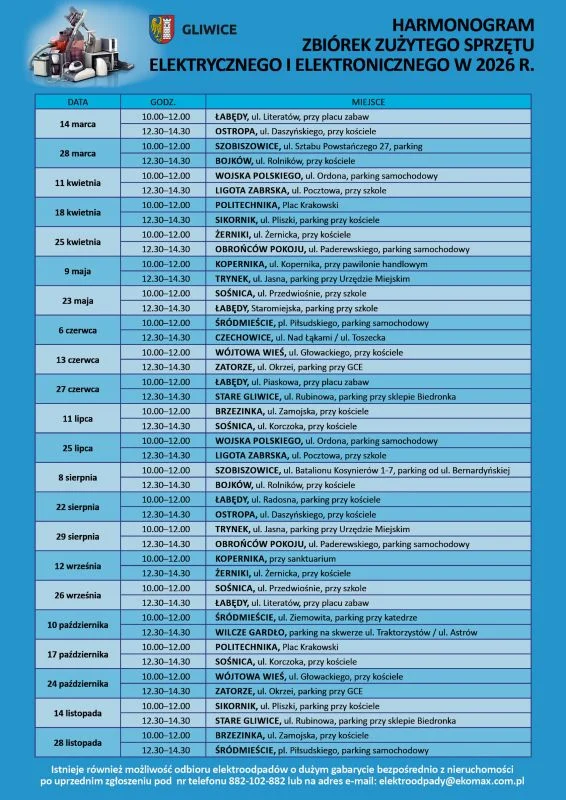 Harmonogram mobilnych zbiórek znajduje się na stronie segreguj.gliwice.eu w dziale Harmonogram wywozu. Przypominamy, że elektroodpady gliwiczanie mogą bez opłat oddawać przez cały rok w miejskim Punkcie Selektywnego Zbierania Odpadów (PSZOK) przy ul. Rybnickiej 199B. Szczegóły na pzogliwice.pl w dziale Dla mieszkańców.