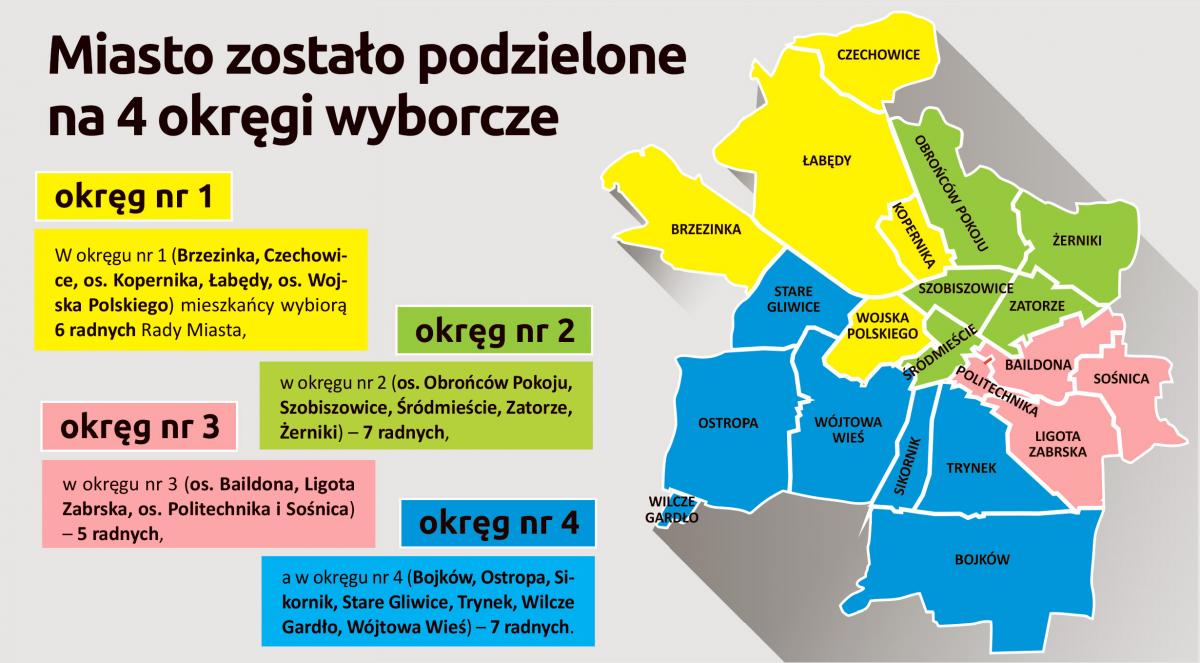 O fotel prezydenta miasta ubiega się 4 kandydatów – ich listę można znaleźć w „Miejskim Serwisie Informacyjnym – Gliwice” na str. 15. 25 radnych Rady Miasta Gliwice nowej kadencji wybierzemy spośród grona 163 osób, których zestawienie znajdziemy na stronach 16–17 „MSI”, w INFORMATORZE WYBORCZYM. Podczas niedzielnego głosowania wskażemy też przyszłych radnych do Sejmiku Województwa Śląskiego. Przypomnijmy, że w gremium tym zasiądzie łącznie 45 osób z całego województwa. W okręgu wyborczym nr 4, do którego przynależą m.in. Gliwice, wybierzemy w sumie siedmiu radnych spośród grona 115 osób. Ich wykaz publikowany jest w INFORMATORZE WYBORCZYM „MSI” na str. 18.
