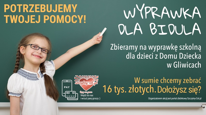 I edycja akcji „Wyprawka dla bidula” serwisu zbiórkowego Szczytny-Cel.pl trwa od 9 do 22 sierpnia br. w różnych częściach Polski, w tym m.in. w Gliwicach, gdzie zbiórka jest prowadzona dla Domu Dziecka Nr. 1 który liczy 16 podopiecznych. Jej celem jest zakup laptopów, komputerów oraz sprzętu sportowego.