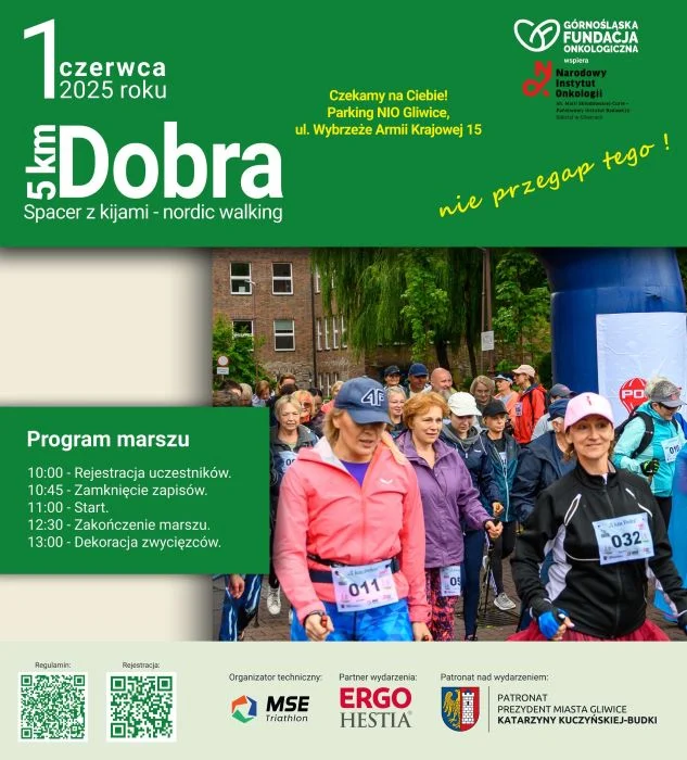 Czy spacerując dla własnego zdrowia można jednocześnie pomóc innym? Zdecydowanie tak! Przekonają się o tym uczestnicy niedzielnego spaceru „5 km dobra” organizowanego przez Górnośląską Fundację Onkologiczną oraz Narodowy Instytut Onkologii w Gliwicach, którzy maszerując z kijkami do nordic walkingu, wesprą działalność gliwickiej placówki.