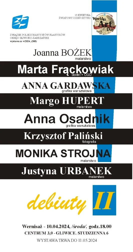 Dlatego właśnie w kwietniu Okręg Gliwicko-Zabrzański Związku Polskich Artystów Plastyków, zrzeszający obecnie 79 artystów różnych specjalności, organizuje wystawę „Debiuty II”, prezentującą twórczość utalentowanych i pełnych pasji nowo przyjętych członków okręgu: Joanny Bożek (malarstwo), Marty Frąckowiak (obiekt + CGD), Anny Gardawskiej (grafika warsztatowa), Margo Hupert (malarstwo), Anny Osadnik (grafika warsztatowa), Krzysztofa Palińskiego (fotografia), Moniki Strojnej (malarstwo) oraz Justyny Urbanek (malarstwo).