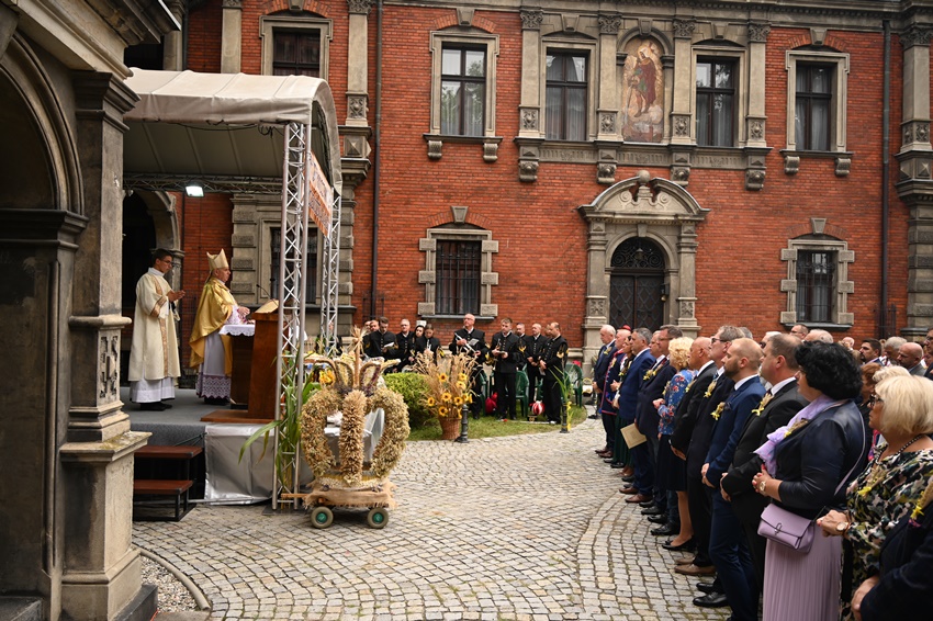Mszę świętą w intencji rolników w uroczym Zespole Pałacowo-Parkowym w Pławniowicach odprawił ks. Jan Kopiec, Biskup Gliwicki. Wcześniej jego Eminencja poświęcił aż 30 koron dożynkowych. Wszyscy wspólnie dziękowali za tegoroczne zbiory! Starostami tegorocznych dożynek byli Mariola i Tomasz Nawrotowie z Chechła.