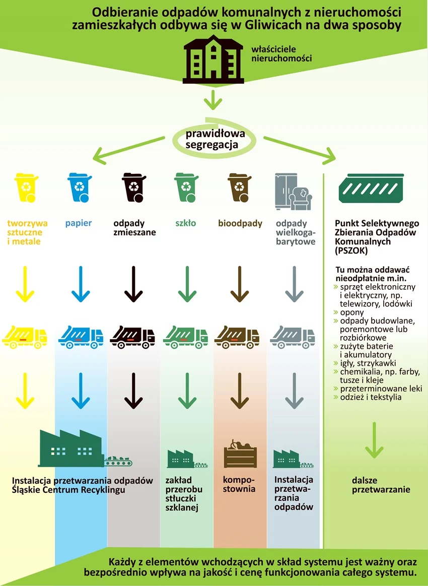 - prawidłowo segregując śmieci w miejscu zamieszkania i przekazując je wybranejw drodze przetargu firmie odbierającej odpady – obecnie Remondis Gliwice Sp. z o.o. (żółty pojemnik – tworzywa sztuczne i metale, niebieski – papier, zielony – szkło, czarny – odpady zmieszane, brązowy – bioodpady oraz osobno odpady wielkogabarytowe);