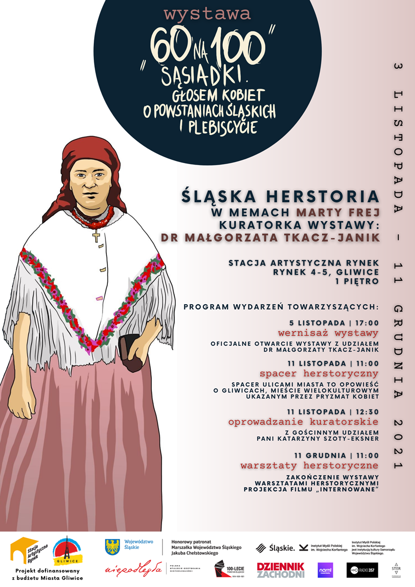 „60 na 100. SĄSIADKI. Głosem Kobiet o powstaniach śląskich i plebiscycie" to mobilna wystawa w postaci wielkoformatowych memów, przedstawiających w skali 1:1 trzydzieści bohaterek z przełomu XIX i XX wieku, w szczególny sposób związanych z burzliwą historią Górnego Śląska, a na tym tle ze śląskimi powstaniami oraz akcją plebiscytową.