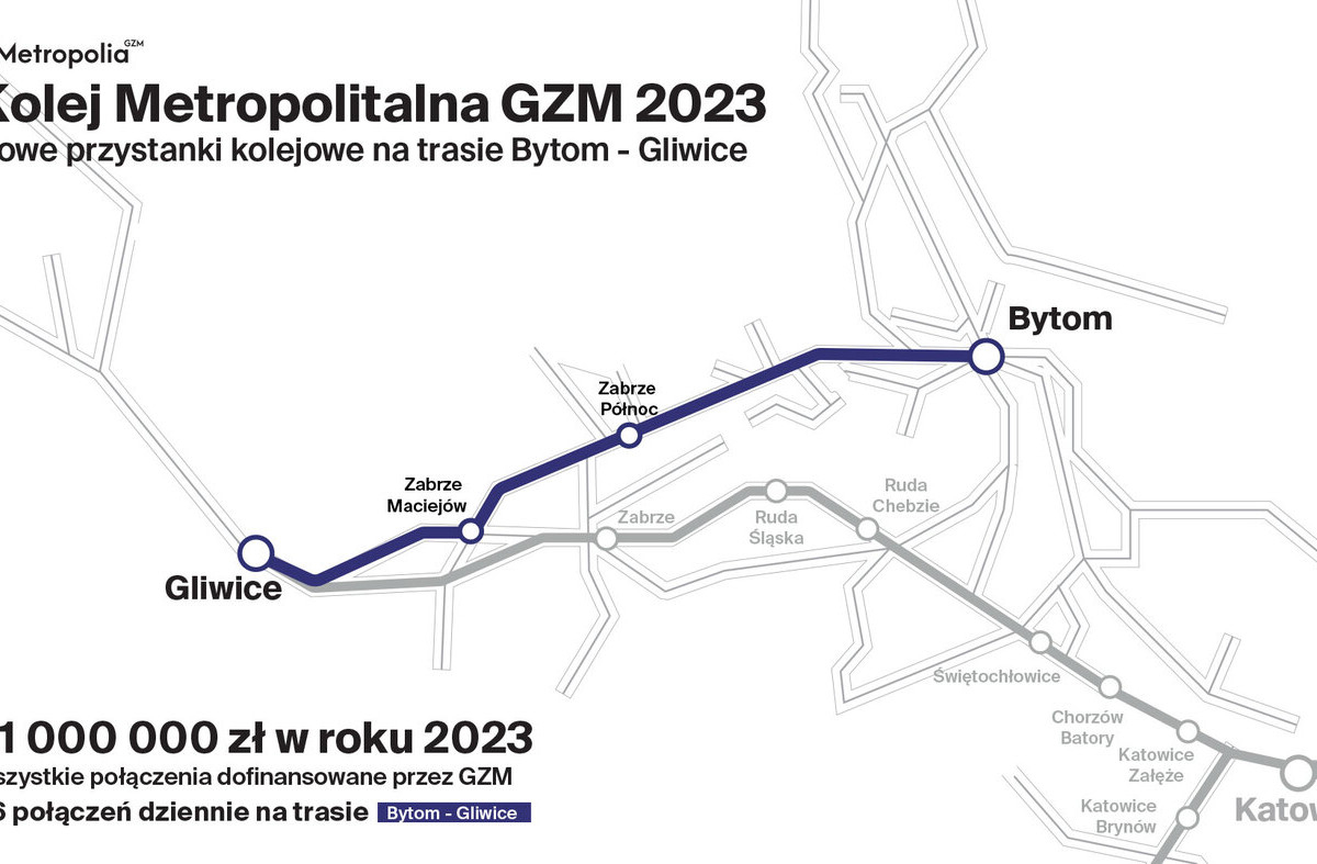 W 2023 roku Górnośląsko-Zagłębiowska Metropolia sfinansuje łącznie 94 połączenia kolejowe za kwotę 21 mln zł. Wśród finansowanych połączeń, 36 dotyczą relacji Bytom-Gliwice, 22 Katowice-Gliwice, 24 Tychy Lodowisko-Katowice, a 12 Tychy Lodowisko-Dąbrowa Górnicza Ząbkowice.