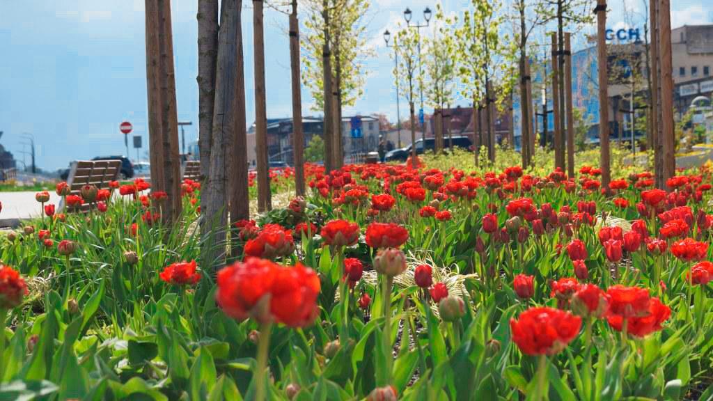 Skwer Europejski zaprasza na druga odsłonę tej wiosny. Zmienił szaty z żółtej na czerwoną i prezentuje się zachwycająco! Wspaniałe narcyzy nacieszyły już wzrok przechodniów i z godnością ustępują miejsca setkom dostojnych tulipanów. Nacieszcie się ich obecnością, bo niebawem ich miejsce zajmą ozdobne czosnki o intrygującej ametystowej barwie.