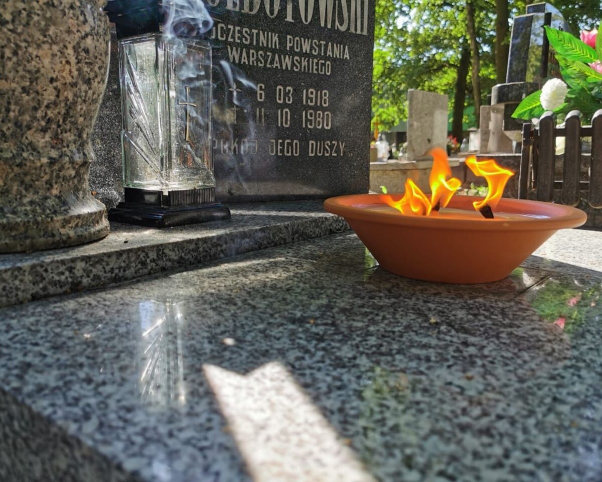Dzisiaj rano zapaliliśmy znicze na grobach znanych nam kilkunastu powstańców warszawskich, spoczywających na Cmentarzu Centralnym i Lipowym.