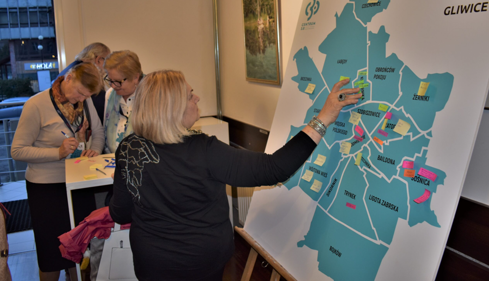 Ważnym elementem spotkania było wspólne budowanie „dzielnicowego moodboardu”. Uczestnicy stworzyli go na wielkiej mapie Gliwic, wylepiając ją kolorowymi karteczkami z informacjach o atutach i ciekawostkach dotyczących każdej z 21 dzielnic miasta.