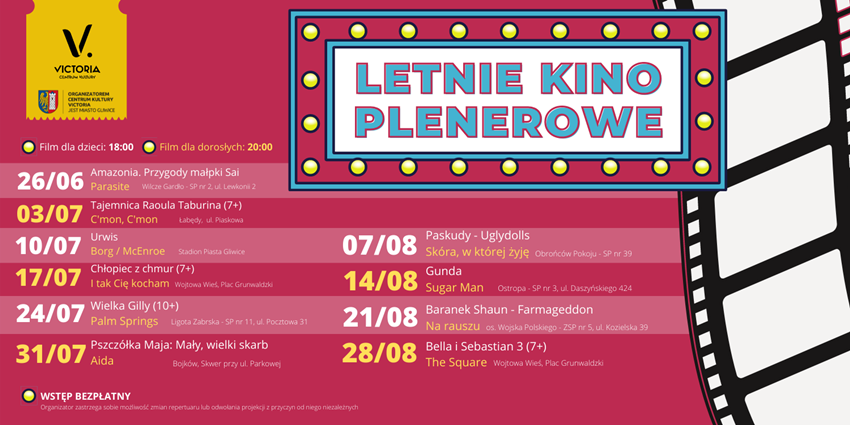 Wstęp na wszystkie seanse jest wolny. Organizatorem Letniego Kina Plenerowego jest Centrum Kultury Victoria.