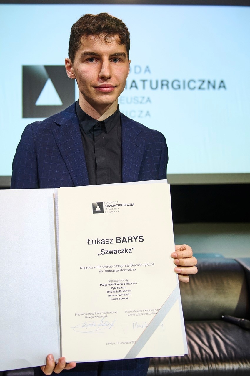 Łukasz Barys jest poetą i prozaikiem, wydał książkę poetycką „Wysokie słońce” oraz powieści „Kości, które nosisz w kieszeni” i „Jeśli przecięto cię na pół”. Otrzymał już Nagrodę im. Adama Włodka oraz Paszport „Polityki”. W sobotę w Gliwicach został laureatem Nagrody Dramaturgicznej im. Tadeusza Różewicza. To ważny konkurs, który ma na celu wspieranie twórców piszących dla teatru oraz promocję najbardziej wartościowych zjawisk zachodzących we współczesnej dramaturgii polskiej.