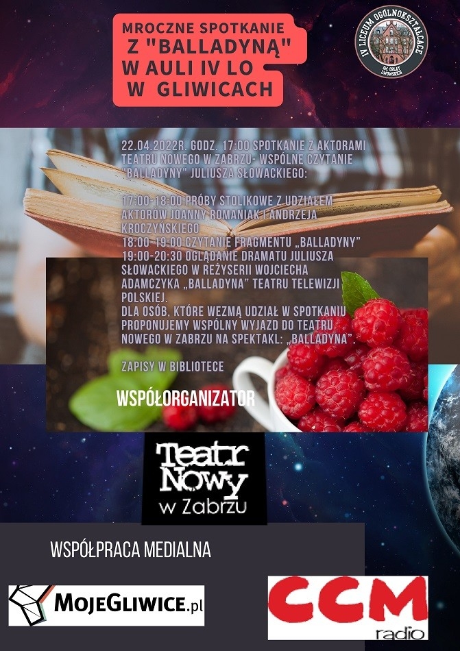 W piątek 22.04.2022r. o godz. 17:00 w auli Liceum nr 4 ul. Kozielska 1a w Gliwicach odbędzie się wydarzenie: Mroczne spotkanie z „Balladyną”.