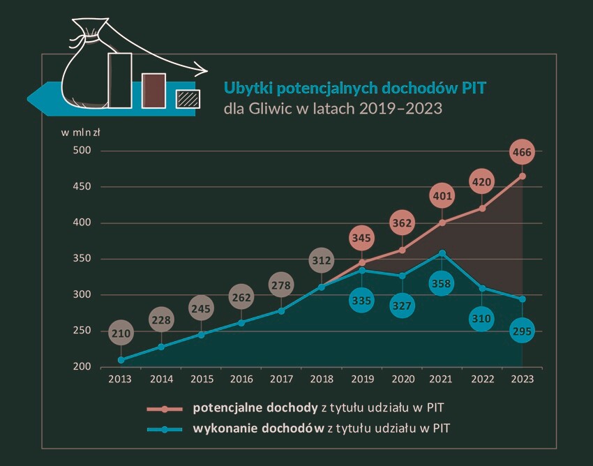 Znacząca część dochodów miasta to udział w podatku PIT. Niestety, zmiany w prawie podatkowym wprowadzone w 2019 roku (obniżono wówczas podatek dochodowy z 18 do 17% i dwukrotnie podniesiono koszty uzyskania przychodów) oraz w 2022 roku (m.in. wzrost kwoty wolnej od podatku, zmiana progu podatkowego, obniżenie stawki podatkowej z 17 do 12%) uderzyły w samorządowe budżety. Zgodnie z wyliczeniami Związku Miast Polskich opartymi na danych Ministerstwa Finansów oraz Ocenach Skutków Regulacji do ustaw zmieniających system PIT, w Gliwicach łączny ubytek dochodów z PIT w latach 2019–2023 wyniesie przeszło 370 mln zł. Natomiast suma tak zwanych rekompensat dla gliwickiego samorządu w 2021 i 2022 wyniesie zaledwie około 83,5 mln zł. Nasze miasto zatem wciąż traci prawie 287 mln zł. Są to niebagatelne pieniądze, bez których tempo rozwoju zwolni.