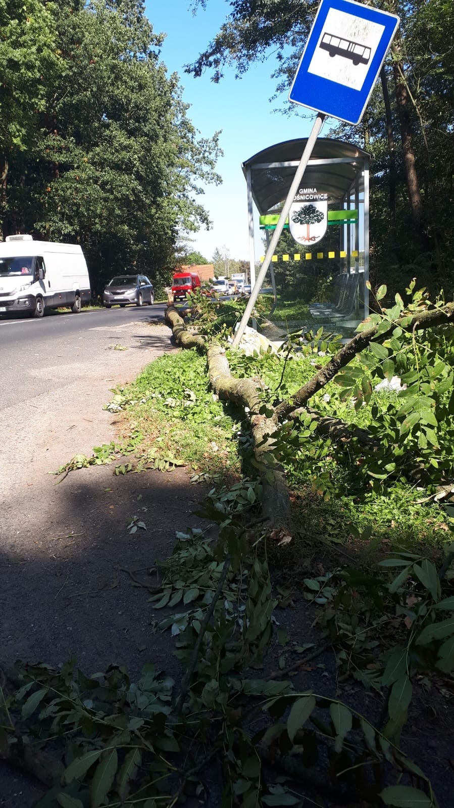 Drzewo nagle przewróciło się na kabinę ciężarówki, powodując przebicie szyby na wysokości głowy kierowcy. Siła uderzenia pojazdu odrzuciła drzewo w stronę stojącego w pobliżu przystanku autobusowego. Nowa wiata uległa poważnemu uszkodzeniu. Na szczęście nikt w tym miejscu nie stał, nikt nie doznał obrażeń. Droga była zablokowana przez kilkadziesiąt minut.