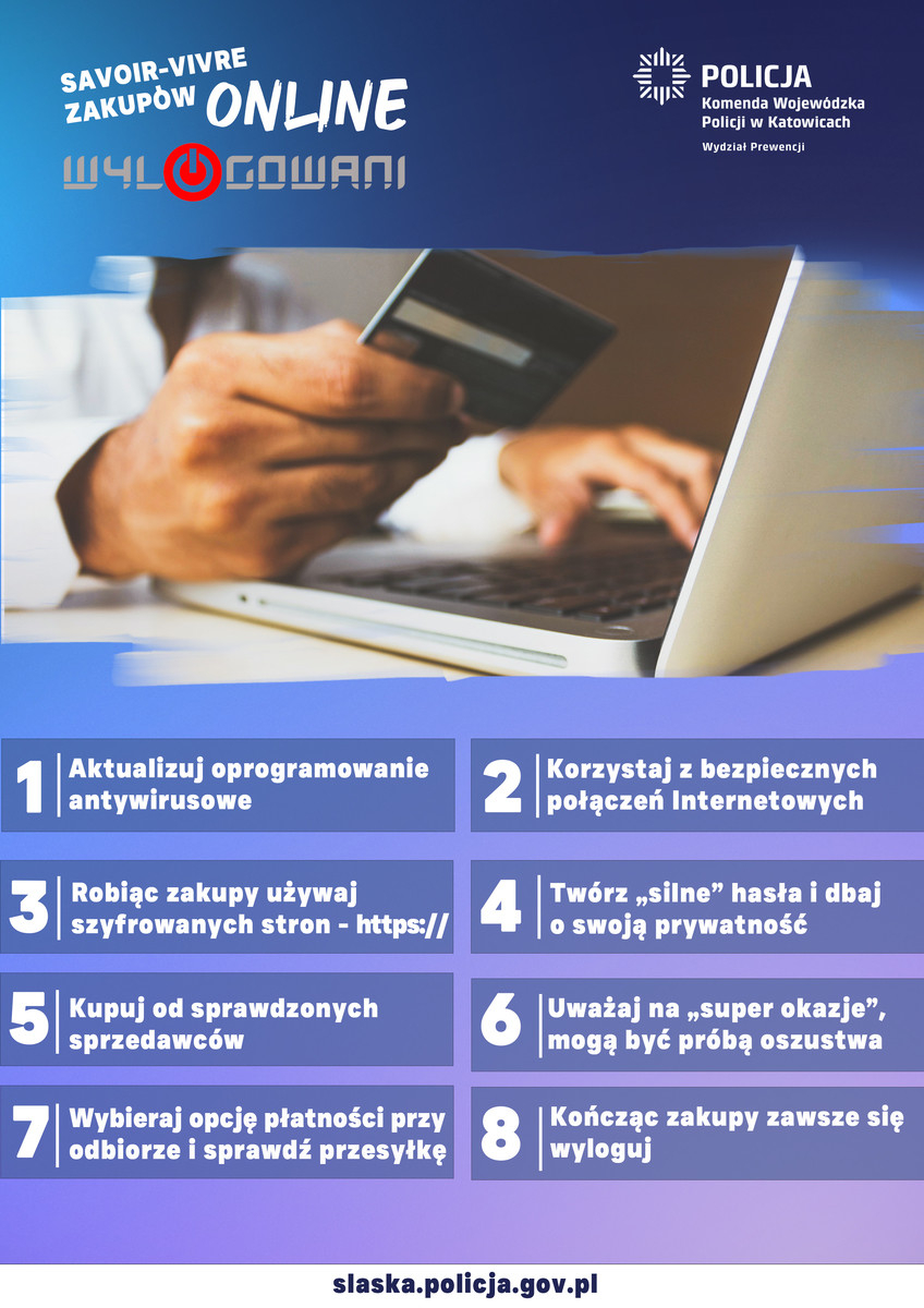 Mając to na uwadze, policjanci z Wydziału Prewencji Komendy Wojewódzkiej Policji w Katowicach, w ramach kampanii "Wylogowani” przygotowali zbiór podstawowych zasad ułatwiających bezpieczne zakupy w Internecie. Opracowany materiał profilaktyczny (plakat), oprócz publikacji w sieci został również przekazany do komend Policji na terenie województwa śląskiego, gdzie mundurowi poprzez dalszą ich dystrybucję (np. do szkół, spółdzielni osiedlowych, klubów seniora) umożliwią szerszemu gronu odbiorców zapoznanie się z przygotowanymi treściami edukacyjnym.