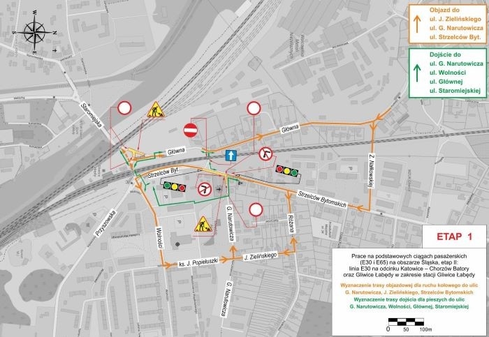 - Przejazd pod wiaduktem kolejowym u zbiegu ulic Głównej i Strzelców Bytomskich będzie odbywał się tylko w jednym kierunku (od strony ulicy Strzelców Bytomskich).