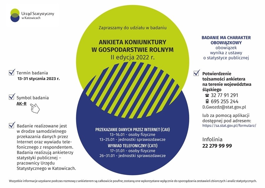Od 13 do 31 stycznia na terenie województwa śląskiego trwa cykliczne badanie statystyczne z zakresu rolnictwa prowadzone przez Główny Urząd Statystyczny. Ankieta koniunktury w gospodarstwie rolnym (AK-R) skierowana jest do rolników. Do końca stycznia można ją wypełnić telefonicznie – rozmawiając z ankieterem z Urzędu Statystycznego w Katowicach.