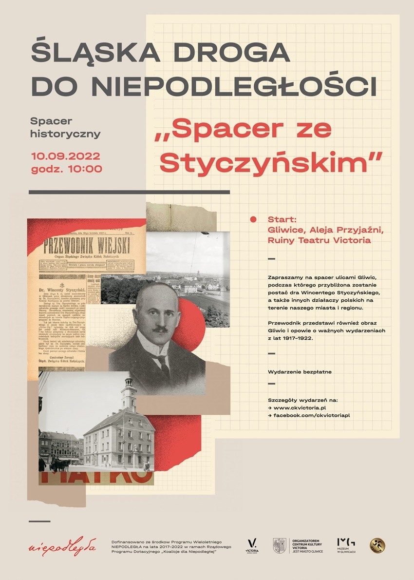 Spacer rozpocznie się przy Ruinach Teatru Victoria przy Alei Przyjaźni 18 o godz. 10:00. W tym samym miejscu uczestnicy będą mogli zobaczyć wystawę plenerową "Gliwice 1917-1922". Oglądać będzie można ją do 29 września. Spacer zakończy się pod tablicą upamiętniającą Wincentego Styczyńskiego, gdzie zostaną złożone kwiaty.