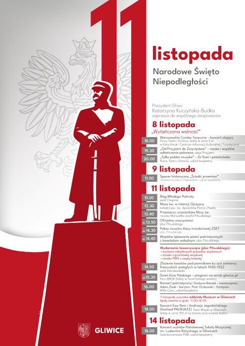 – Zaprosimy wszystkie pokolenia do wspólnego świętowania. Przyjdźcie z rodziną, przyjaciółmi i sąsiadami. Spotkajmy się, by świętować to, co najważniejsze – naszą wolność, wspólnotę i niezależność – mówi Katarzyna Kuczyńska-Budka, prezydentka Gliwic. – Zapraszamy was całymi rodzinami na obchody pełne muzyki, tańca, smaków, wspólnego śpiewania, biało-czerwonych barw i serdecznych spotkań. Niech to będą dni, kiedy z dumą i uśmiechem pokażemy, jak dobrze być razem – dodaje.