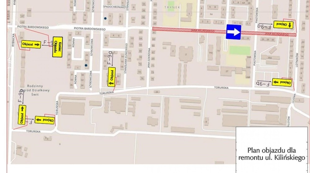 W związku z pracami z ruchu zostanie wyłączona połowa jezdni, będzie obowiązywał ruch jednokierunkowy z wjazdem od ul. Bardowskiego w stronę ul. Lotników. Objazd zostanie poprowadzony ul. Toruńską i Rybnicką. Remont ul. Kilińskiego potrwa około dwóch tygodni.