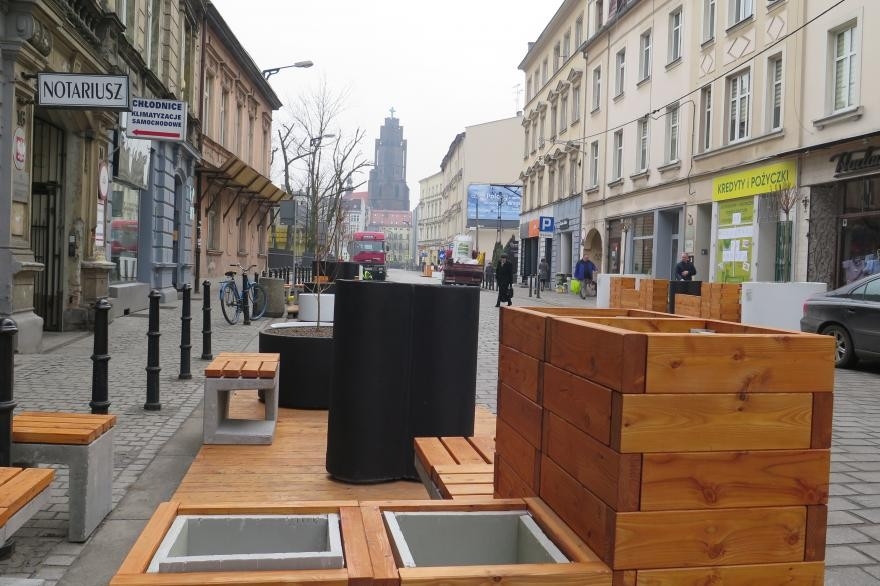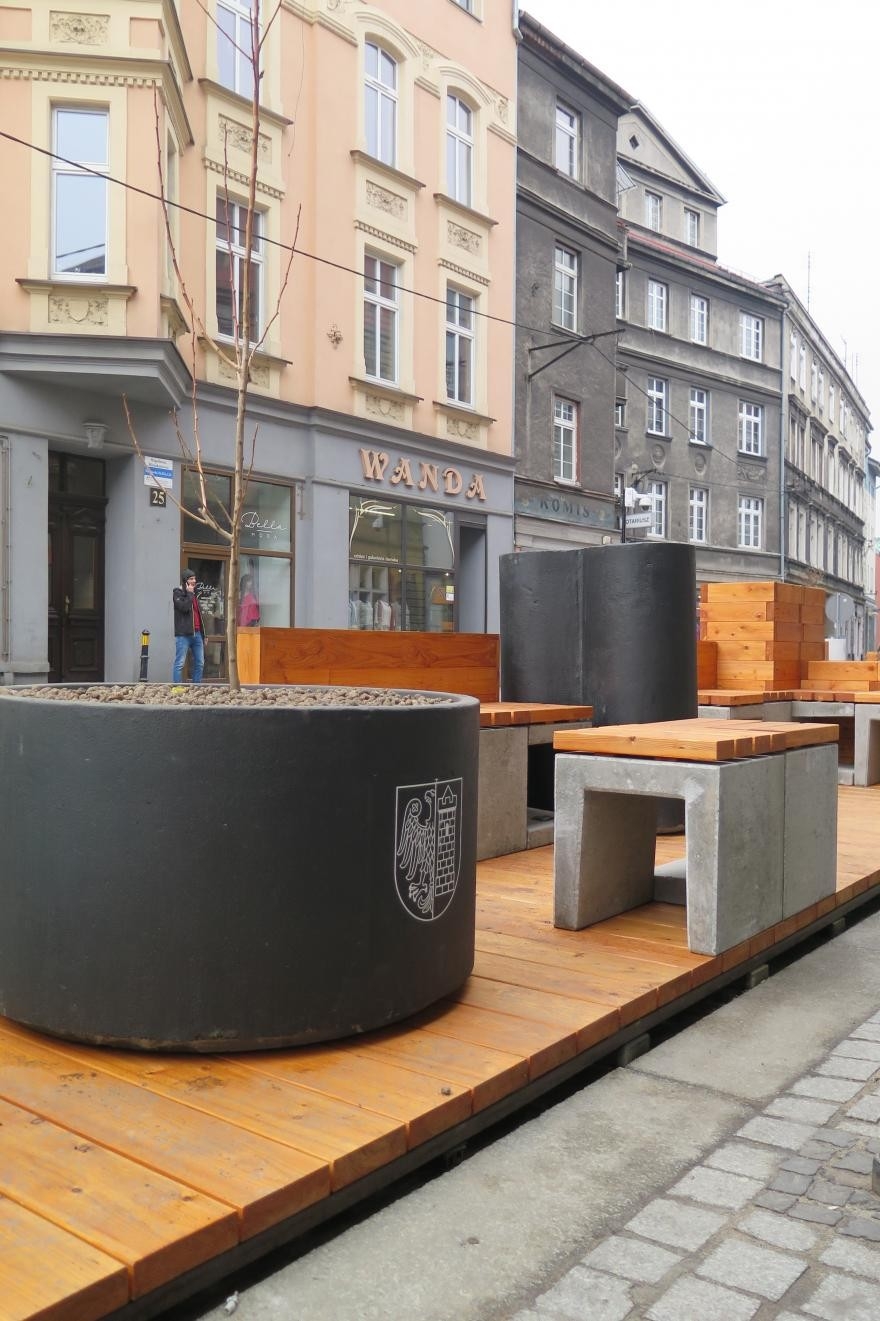 W kilku miejscach ustawiono specjalne podesty z siedziskami, które – usytuowane wyspowo – poszerzyły strefę chodników. Ich funkcja będzie bardzo istotna – tworzą miejsce wypoczynku i relaksu dla przechodniów oraz przyjazną przystań zachęcającą do chwili rozmowy czy wypicia kawy.