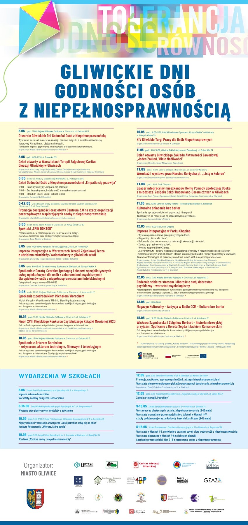 Od 5 do 15 maja odbędzie się też wiele imprez integracyjnych uczących równości i tolerancji dla osób z niepełnosprawnościami, m.in. spotkania w Warsztatach Terapii Zajęciowej w Gliwicach, Finał Konkursu Czytelniczego Książki Mówionej w Miejskiej Bibliotece Publicznej, XIV Gliwickie Targi Pracy dla osób z niepełnosprawnościami oraz wydarzenia kulturalne, m.in. organizowane przez Centrum Kultury Victoria kulturalne śniadanie bez barier, spotkania informacyjne i imprezy integracyjne w placówkach oświatowych.