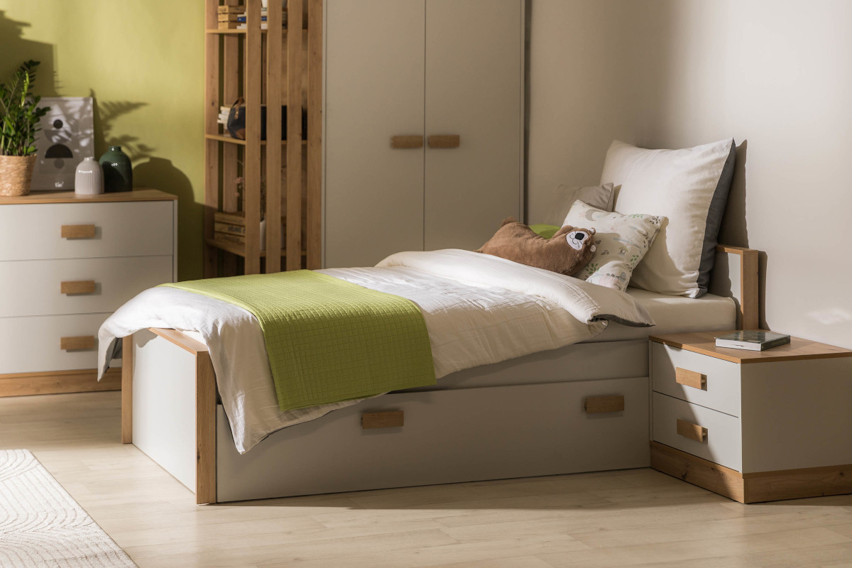 Jeśli w pokoju roi się od drobiazgów i bibelotów, niezwykle przydatne będą dodatkowe szuflady pod łóżkiem i schowki pod stelażem. Meble o niezwykle prostej konstrukcji lepiej nadają się do pomieszczeń pełniących wyłącznie rolę sypialni, w których nie ma potrzeby wygospodarowywania dodatkowego miejsca do przechowywania.