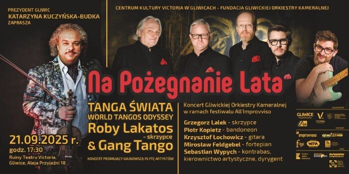 Na scenie wystąpi Gliwicka Orkiestra Kameralna, która zagra wspólnie z zespołem Gang Tango oraz światowej sławy skrzypkiem Robym Lakatosem. Artyści zabiorą publiczność w niezwykłą podróż przez różnorodne oblicza tanga z najdalszych zakątków świata – od klasycznych kompozycji Piazzolli i Gardela, po polskie i żydowskie perełki.