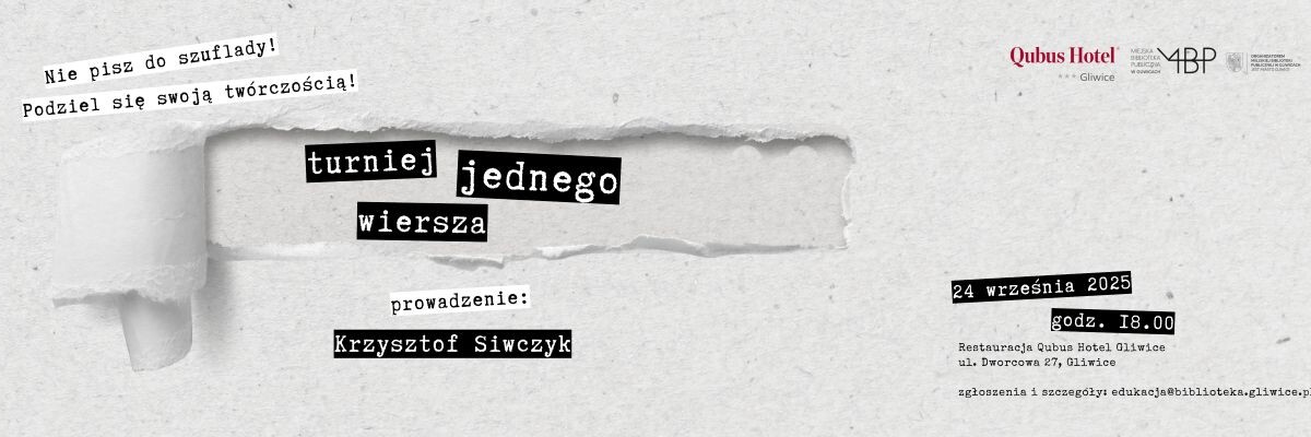 Miejska Biblioteka Publiczna po raz siódmy zaprasza wszystkich miłośników poezji – zarówno piszących, jak i słuchających – na Turniej Jednego Wiersza. Spotykamy się 25 września o godz. 18.00 w klimatycznej przestrzeni Restauracji Qubus Hotel Gliwice, by wspólnie celebrować słowo, emocje i twórczą odwagę.