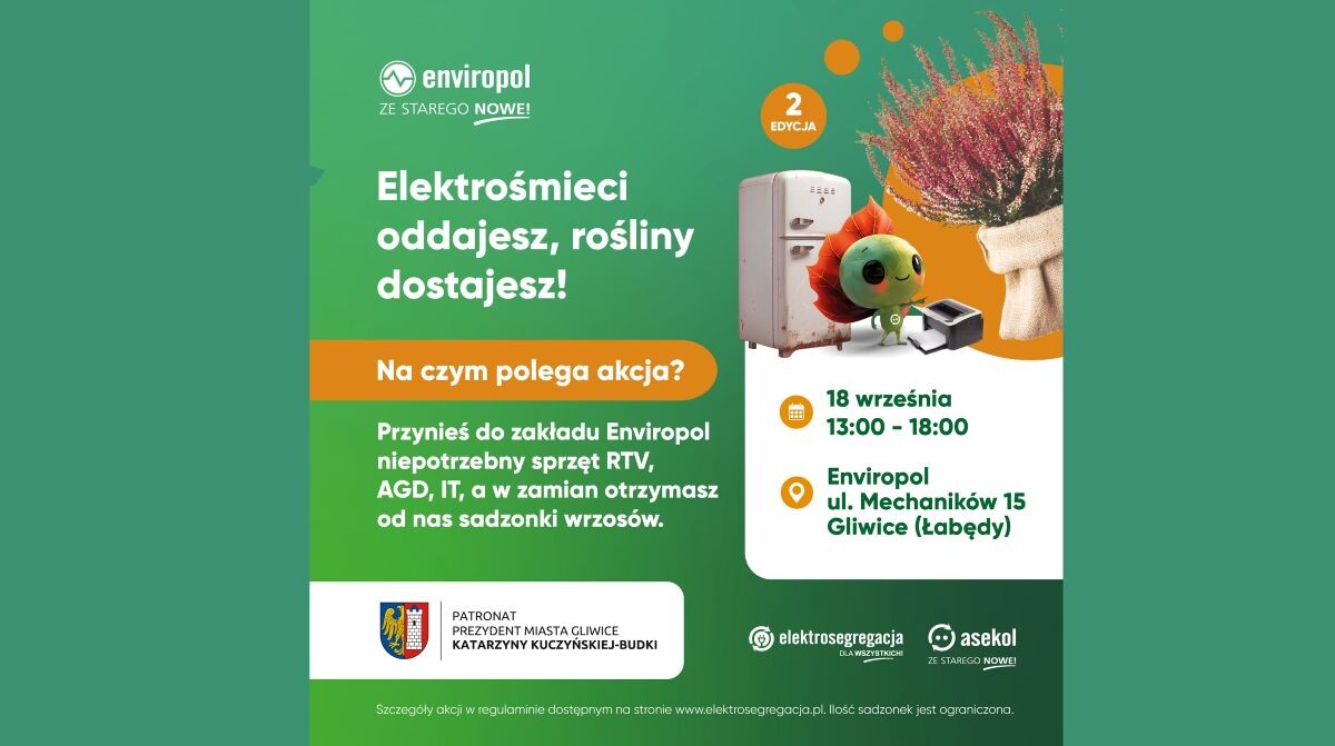 Masz zużyty albo niepotrzebny sprzęt elektryczny i elektroniczny? Pod żadnym pozorem nie wrzucaj go do kontenera. Bądź EKO i skorzystaj z akcji Elektrośmieci Oddajesz, rośliny dostajesz! To już druga edycja – pod patronatem prezydent Gliwic Katarzyny Kuczyńskiej-Budki.